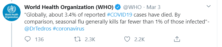 As seen above, the ratio of infections to deaths is actually higher in COVID-19. The World Health Organization stated on 03/04/2020 that the death rate was 3.4%.