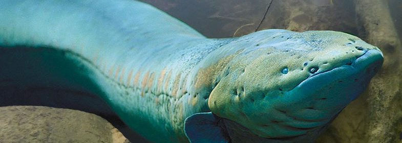 Electric eels are fairly large getting up to 6ft(1.8m) in length and can weigh over 40lb(18kg). They primarily live in the fresh waters of South America are eaten by some natives. Their only natural enemies as adults are jaguar, caiman, and humans.
